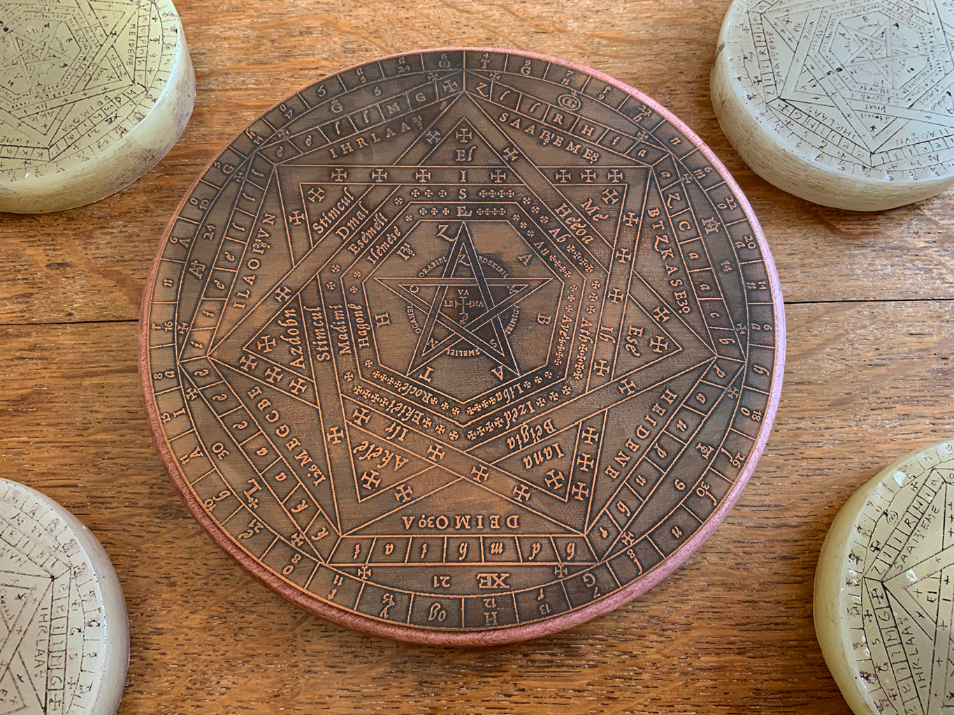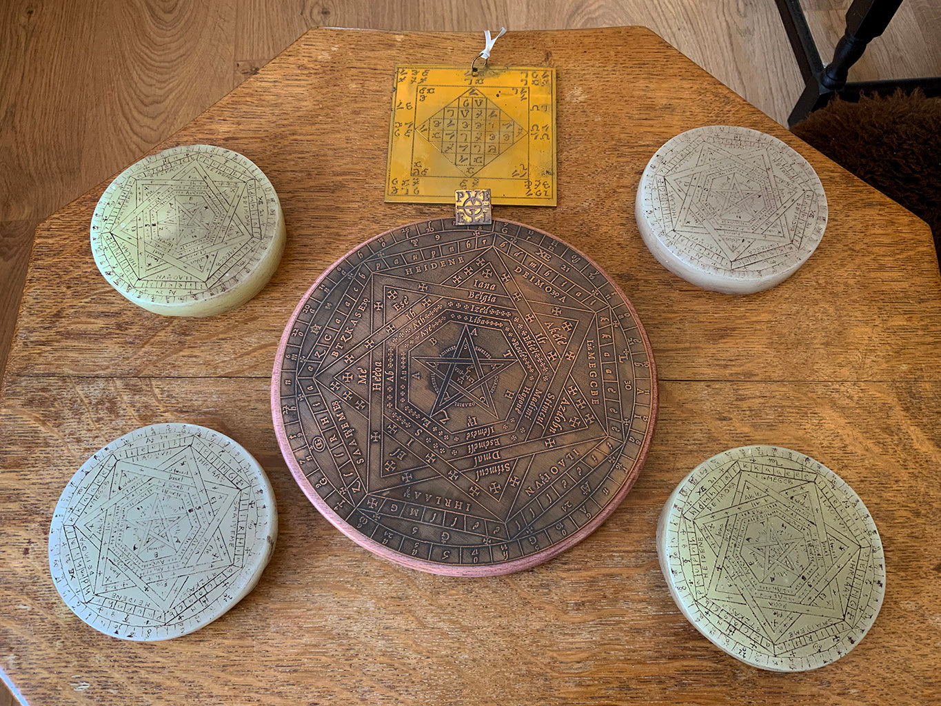 - One large SIGILLUM DEI AMETH (approx 19cm diameter) carved on a copper disc which is fixed to a wooden base.